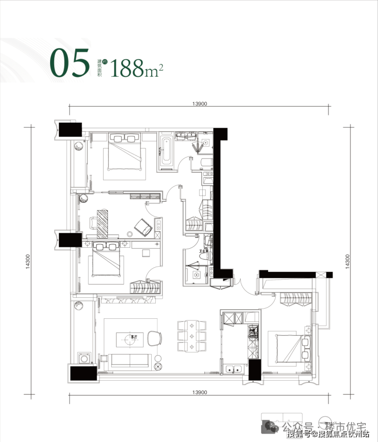 南塔商务公寓:34层,3梯5户,130套,