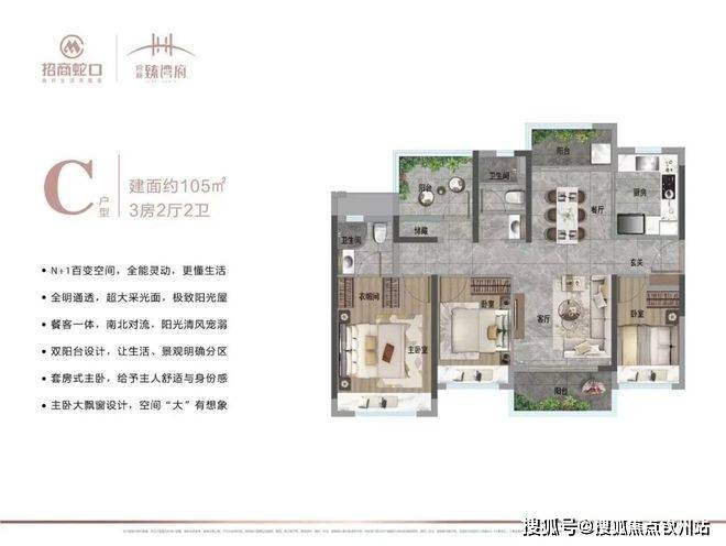 还有建面约105㎡的三房户型,不仅是单一的功能性居住,而且转向品质生活。