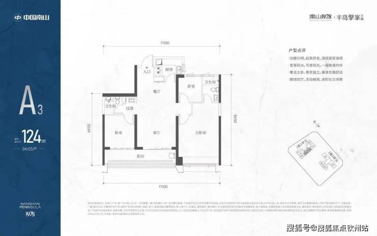 A3也是两条腿,分别是1-1栋04/05,主朝向是东南向,双龙抱珠格局。客厅拥有超大观景阳台,缺点是公卫是个暗卫,小次卧和主卫也对天井外走廊,采光不足。