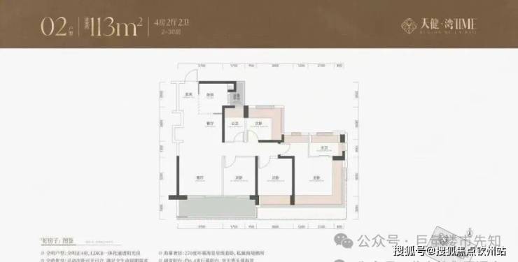 113㎡4房2卫:6.4米阳台联动小房间,如果只需要3个房可改为大客厅,景观无敌,得房率超100%,层高3.15米,厨房外带设备平台可做生活阳台,北向的次卧面积更加适宜,还采用了双面飘窗。