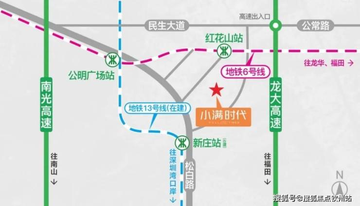 双地铁:6号线(距红花山站直线距离约500 米),13号新庄站(建设中),直通深圳北、罗湖及福田;