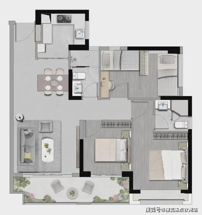 (1)72㎡两房:适合小家庭或单身人士,竖厅格局,客厅开间3.5米,主卧约12.93㎡,次卧约9.99㎡(含飘窗),L型厨房搭配干湿分离卫生间。