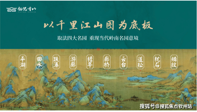 园林设计以《千里江山图》为灵感蓝本,巧妙融合岭南四大名园精髓,复刻佛山梁园"半边亭"。通过"漫卷云章"、"金水澜庭"、"琉璃水院"三进式景观轴线,呈现移步换景的东方美学。