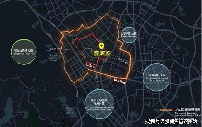 位于深圳市都市核心区、中部发展轴,横跨龙华、民治、大浪三个街道,南部紧邻深圳北站国际商务片区,东北部为龙华富士康和坂雪岗科技城,西部为阳台山森林公园,交通便利,地理位置优越。