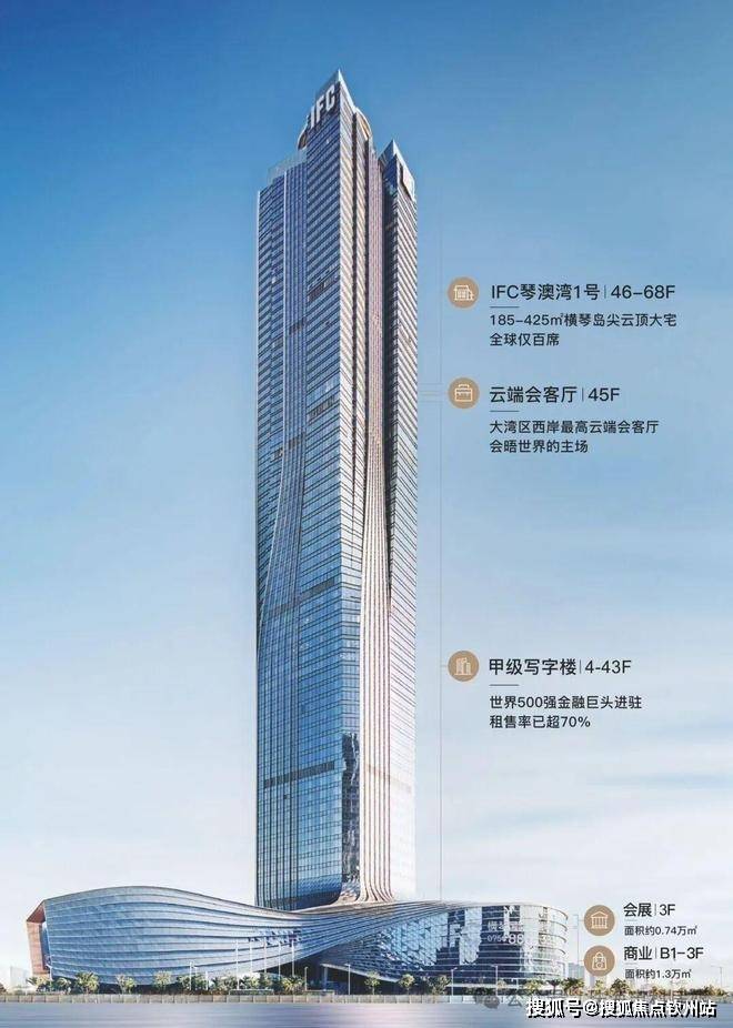 IFC横琴国际金融中心:建筑高度339米,是珠澳第一高楼。华发集团连袂凯达环球Aedas以“乘风驭势,蛟龙出海”为理念,寓意着新生力量磅礴跃起。占地面积约2.3万㎡,总建筑面积约21.8万㎡,集高端住宅、甲级写字楼、高端商业、会展中心、空中会所等多元高端业态,共69层,其中: