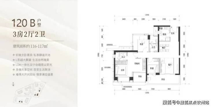105㎡的3房2厅2卫,B户型(2栋3单元02/06户型),设计的是经典竖厅格局,客厅3.6米开间,LDKB一体化设计,三开间朝南,动静分区,3个卧室分别做到了主卧13.12㎡/次卧9.9㎡/次卧8.4㎡(包含墙体飘窗),客厅连接次卧出6.4米长的宽景大阳台,U型厨房,卫生间干湿分离,得房率约90%(包含赠送),正南或东南朝向。