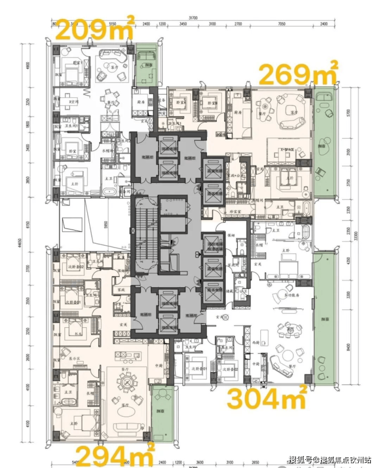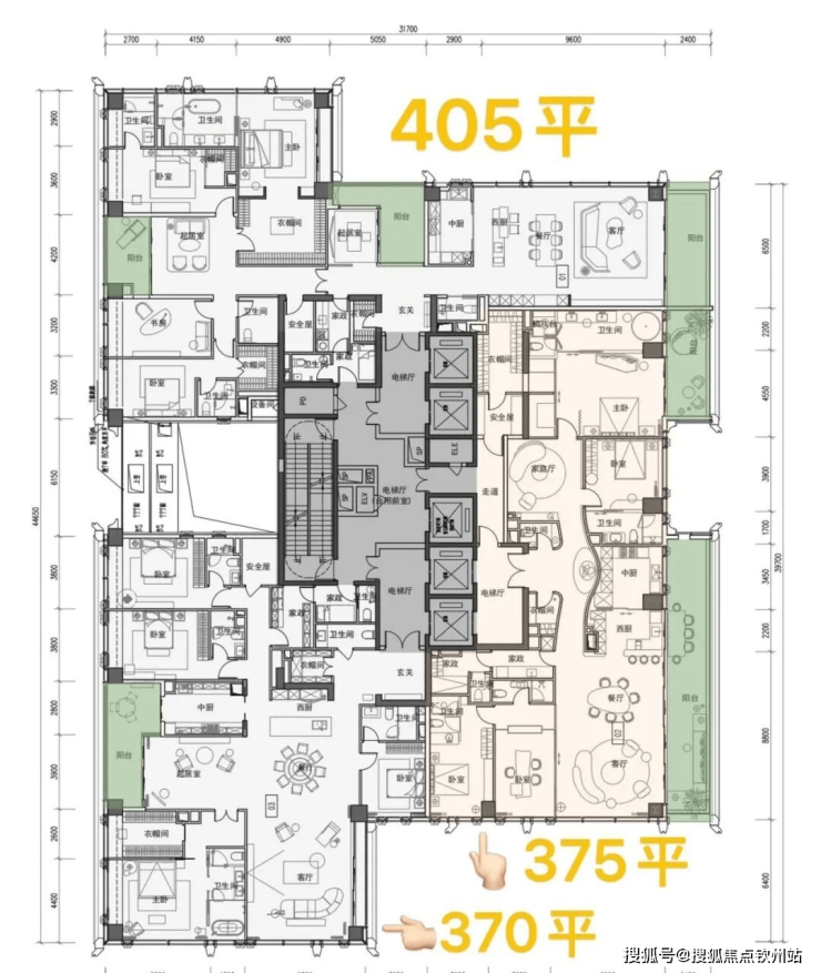 ②高区42F起(150-200米)是约370-375-403㎡4+1房五卫+家庭厅+家政套间;