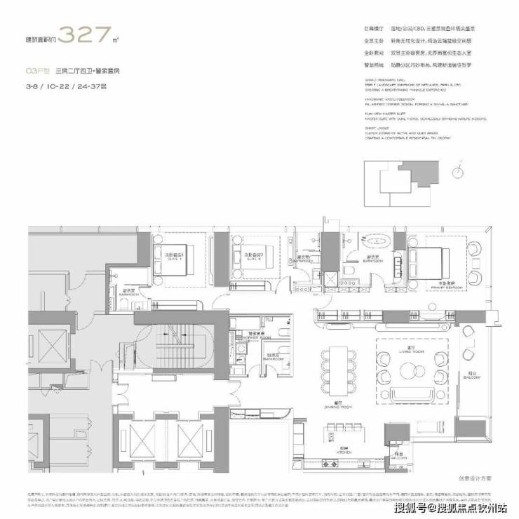 首批推出 303/327/400/570㎡大平层,均通燃气且配备超大阳台,部分户型采用 270° 环幕视野设计。
