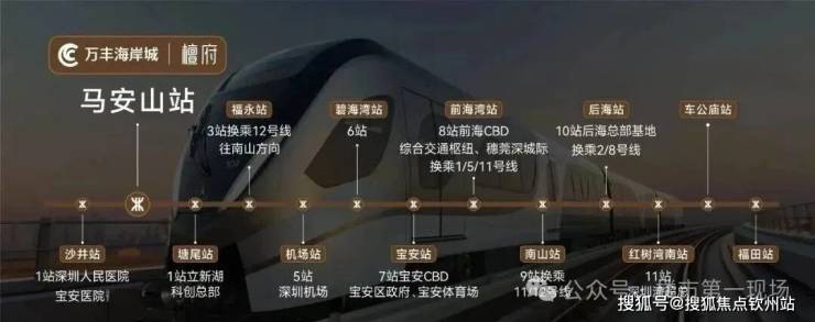 地铁配套:万丰海岸城檀府的交通配套极为便捷,形成了"地铁+公交+自驾"三位一体的立体交通网络。地铁方面,项目距离11号线马安山站直线距离约300-600米,步行3-5分钟可达,该站设有D出口直接连接项目,且站内设有母婴室、无障碍通道等人性化设施。11号线可与深圳地铁1号、2号、3号、5号、6号、7号、9号、12号等8条线路直接换乘,半小时可达宝安机场,40分钟可到南山科技园,50分钟可达福田中心。