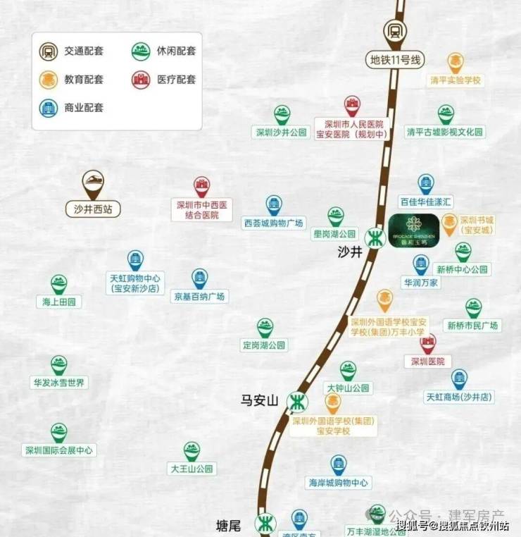 项目紧邻百佳华·佳漾汇,享有便捷生活。商场内设有24小时娱乐中心“佳华啷街”和天台露营区,激活夜经济。步行10分钟可达天虹商场(沙井店),2025年升级后引入国际美妆品牌,设有IP拍照点和3折直播活动,超市提供现切生鲜服务。2公里内有万丰海岸城购物中心(20万㎡),2025年10月开业山姆会员店,空中廊桥连接项目,驾车5分钟可达。购物中心规划“潮未江湖”街区,汇聚特色餐饮和宝安北首店MUJI、URBAN REVIVO等,提供高品质消费体验。