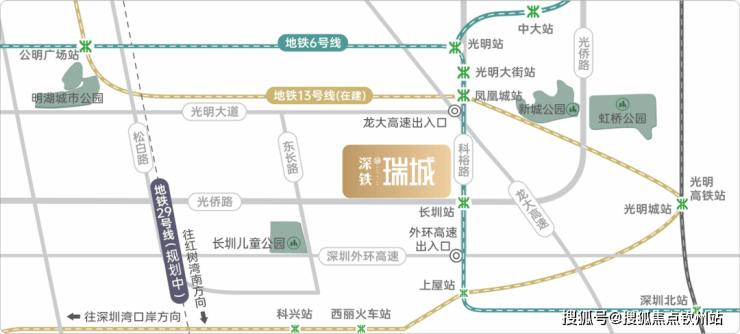 深铁瑞城,由深铁集团打造,位于光明区凤凰街道光桥路与科裕路交汇处,项目所在区位属于光明科学城产业转化区,堪称光明版的南山粤海街道,连续3年蝉联光明区GDP总量第一,在2021年GDP总量为351.9亿元,也是深圳先进制造业新高地,湾区科研经济主阵地,家门口的光侨路串联起光明云谷、科学方舟、凤凰新型产业集群、光明城TOD、华星光电产业集群、长圳TOD、玉塘新型产业集群,被称为光明版的“深南大道”。