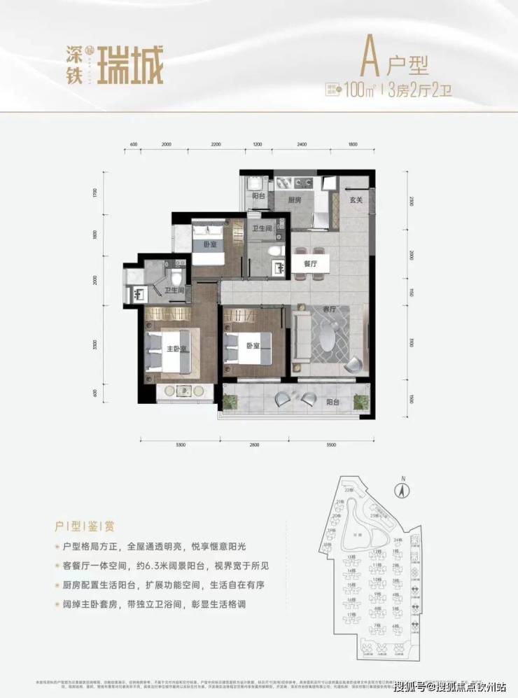 100㎡的3房2厅2卫,A户型,设计的是经典竖厅格局,进门入户玄关,客厅3.5米开间,LDKB一体化设计,动静分区,3个卧室分别做到了主卧12㎡/次卧7.57㎡/次卧6.01㎡(实测面积,去掉墙体),客厅连接次卧出6.3米长的阳台,L型厨房还带1个生活阳台,卫生间干湿分离,得房率约:75.76%(不含赠送),西南或东南朝向。