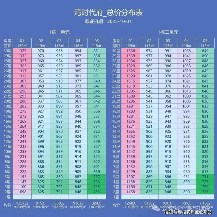 139㎡:2单元01户型(7.84万/㎡)大于1单元01户型(7.77万/㎡),价差约1000元/㎡;