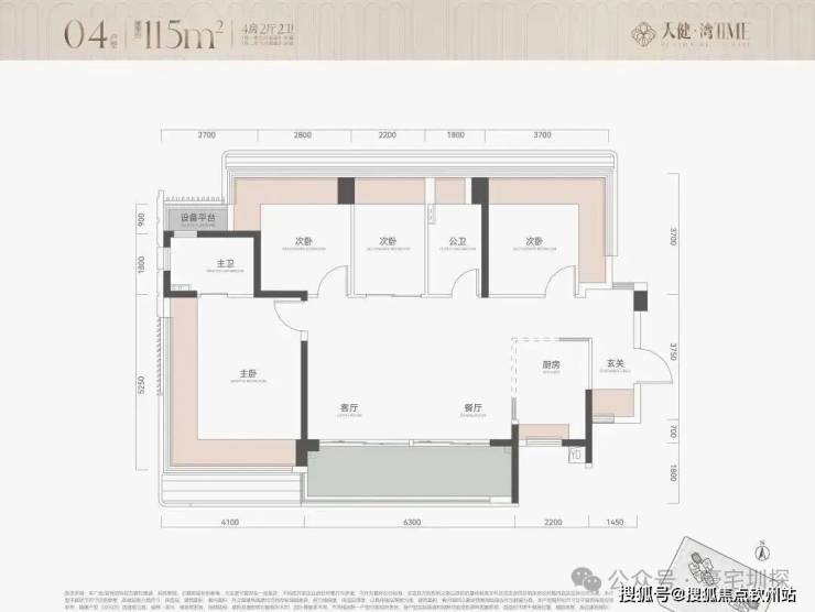115㎡4房2卫,横厅户型,朝南看海,入户独立玄关,但三个次卧朝北;