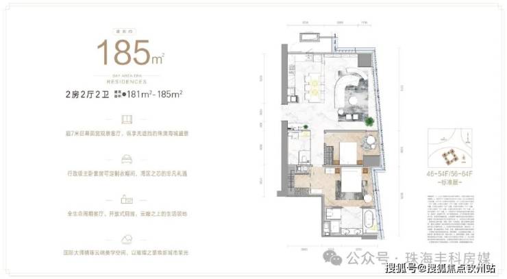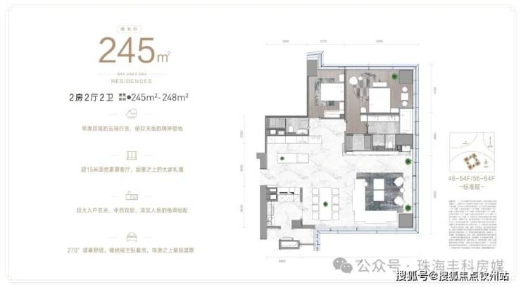 46 层到 68 层是 70 年产权的天际住宅(约3.8万㎡)——IFC琴澳湾1号,拥有185-425㎡户型,IMAX天幕大境、奢阔海景、云端之上的尊贵人居和社交主场;