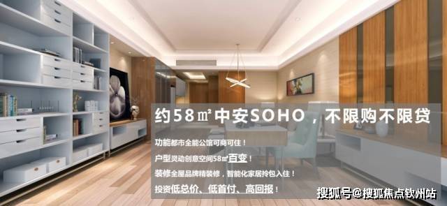 中安SOHO是中安广场的酒店式资产。在全国住宅限购大潮下, 不限购不限贷 的中安SOHO的推出可谓恰逢其时。约 58㎡ 的中安SOHO,百变组合,可多间、半层、整层等自由组合;层高约 3.6米-4.2米 ,办公居住皆宜,可做私人创意室、私人收藏馆、私人会客厅等多种创享空间,投资潜力不可估量。