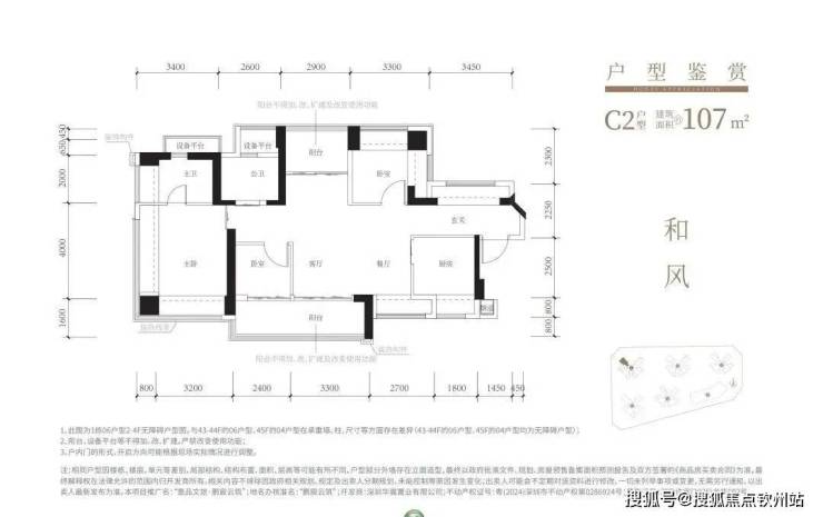 107㎡的4房2厅2卫,设计的是横厅南北通透格局,进门赠送约4㎡入户玄关,客餐厅5.9米开间,4个卧室分别做到了主卧17.9㎡/次卧9.48㎡/次卧8.47㎡/次卧6.06㎡(实测面积,去掉墙体),主卧+1个次卧270°飘窗,客厅连接次卧出5.7米长大阳台,U型厨房,得房率约102.5%(包含赠送),阳台主朝西南向。