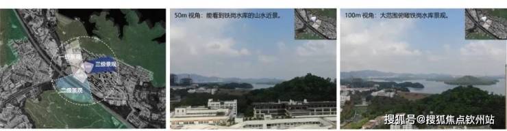周边多个自然景观环绕,从地块50m高度视角可看到铁岗水库的山水近景,100m高度视角可俯瞰大范围的山水景观,视野感受极佳。