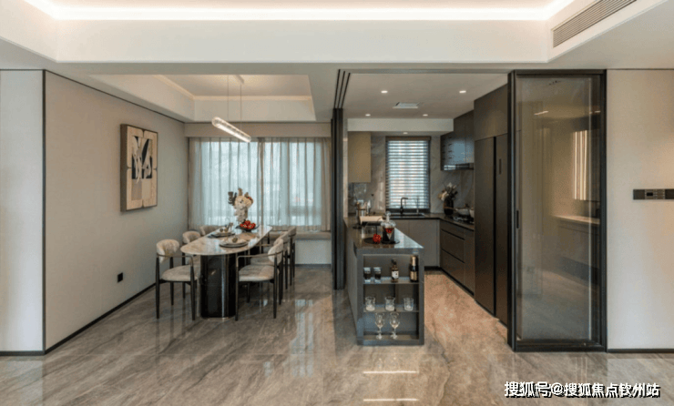 收纳亮点:针对玄关、厨房、卫生间等不同空间需求进行收纳系统配备,玄关采用800库形式组合,加大储物功能的多样化,厨房地柜加吊柜以及岛台组合形式,更加扩大储物空间,卫生间镜柜及浴室柜分割合理性,加大储物量。
