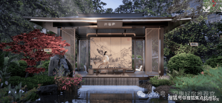 鹏宸云筑这种有点新中式味道的园林风格设计,也算是比较少见的,特别是这种风格,应该也属于新中式的一种,在中国文化复兴的现阶段,是个加分项。