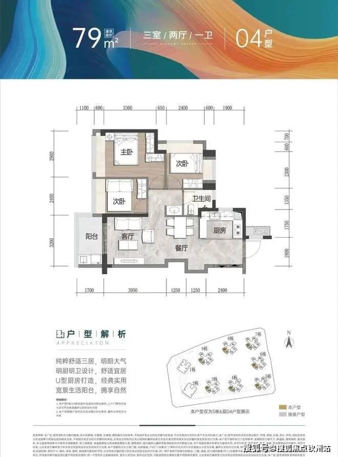 (1)78-80㎡三房一卫:竖厅设计,U型厨房,主卧带270°飘窗;
