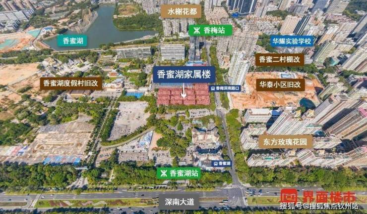 项目一南一北分布着两大地铁站:9号线香梅站、1号线香蜜湖站,香蜜湖、香蜜公园、特区报社等环伺其间,还有大片旧改。