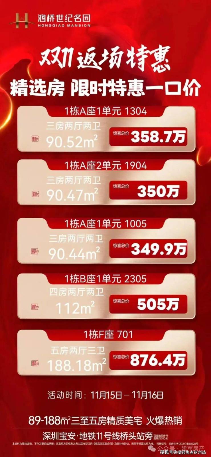 宝安福永,鸿桥世纪名园于2024年11月15日取证入市!首推1栋A座/B座/F座,共392套房源,面积有89-90㎡的3房2厅2卫,113-125㎡的4房2厅2卫,188㎡的5房2厅3卫户型,备案均价4.73万/㎡,备案单价3.96-5.45万/㎡,总价在357-1026万/套,预计在2026年7月份带简装交房。