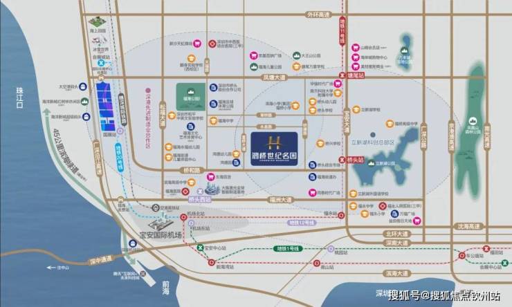 鸿桥世纪名园位于宝安区福海街道,毗邻宝安大道,富桥大道、永昌路和桥塘路的围合地块内。项目周边三轨环绕,且均能直通深圳市中心区域,跨区域出行的优势突显。东面距离地铁11号线桥头站约600米左右;西南面约1.1公里布局有地铁12号线桥头西站;西面约1.6公里开外还有穗深城际福海西站直通深圳机场和东莞、广州。