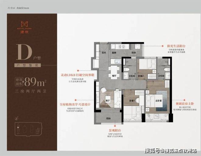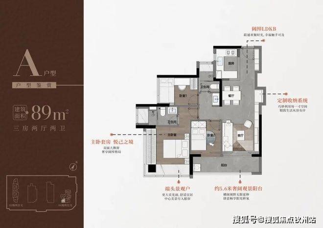 89㎡的3房2厅2卫,A户型(1栋1单元06户型),设计的是经典竖厅格局,进门入户玄关,LDKB一体化,S墙设计预留冰箱卡槽位,三开间朝南,动静分区,主卧双面大飘窗,客厅连接次卧出5.6米长的观景阳台,U型厨房,公卫三段式分离,得房率76.78%(不含赠送),套内面积69.1㎡,东南朝向。