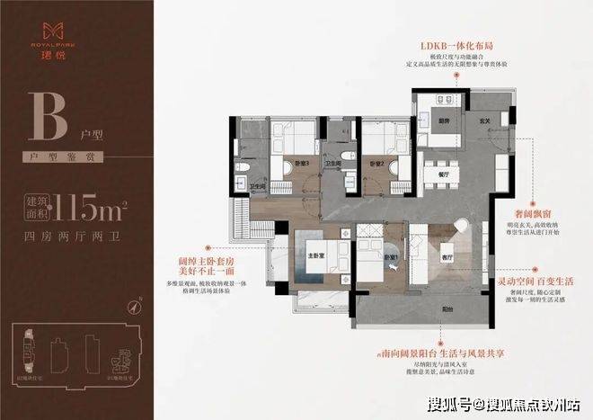 115㎡的4房2厅2卫,B户型(2栋1单元01/06户型),设计的是竖厅格局,进门入户玄关,LDKB一体化布局,三开间朝南,动静分区,客厅连接次卧出阔景大阳台,U型厨房,公卫三段式分离,西南朝向,靓点是端头位可以做到南北通透。