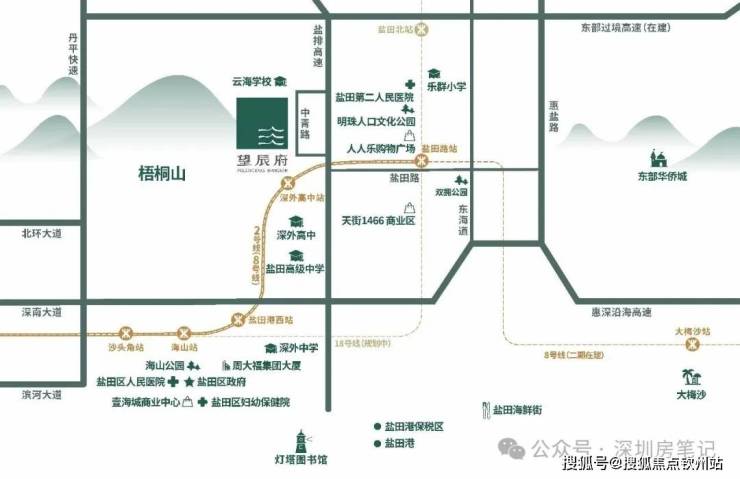 望辰府位于盐田港片区,中青路半山溪谷花园西侧,梧桐山半山腰上。这个位置,属于盐田港全新开发的区域,附近楼盘基本都是2015年后新建的,城市界面相当新。