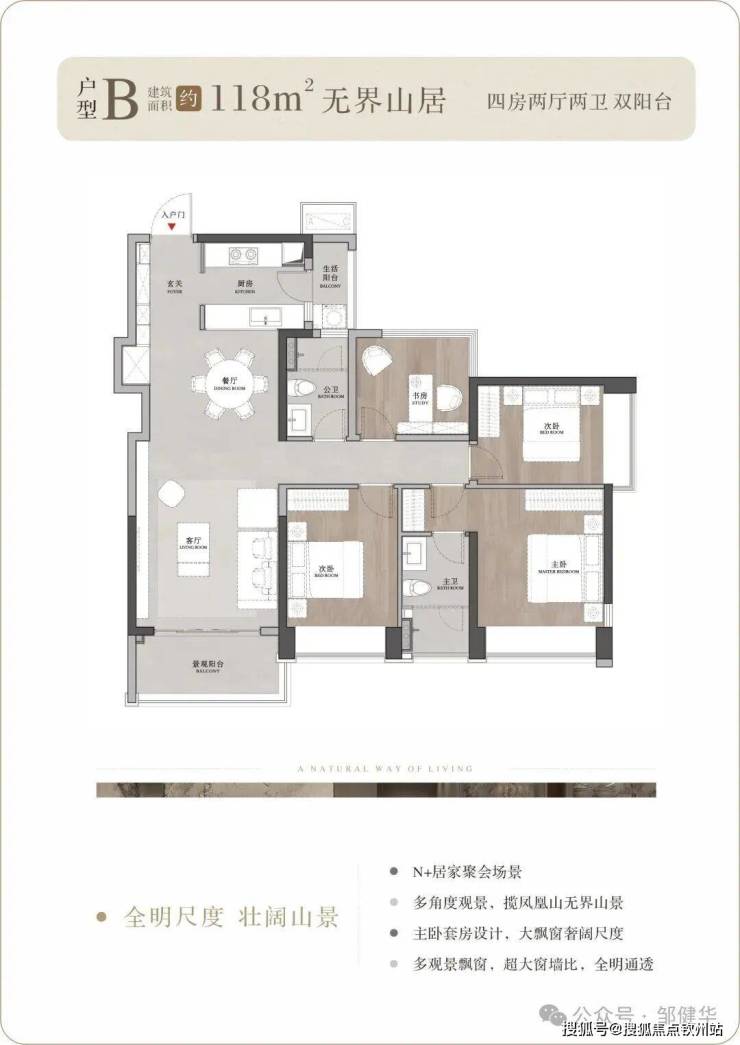 户型背山面海,超大的窗墙比将窗外无价的山海资源揽入户内,所有户型都可以看到开阔的山景,部分户型高楼层可以同时看到山海景观;南向大面宽、小进深,结合现代人家居理念的LDKB一体化设计,打造城市之芯的巨幕山海。