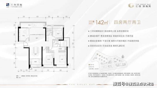 115方和142方南北通透四房,不过这个南北通是阳台和厨房窗户南北通,开窗通风可能会有油烟进入客厅。想要景观房的有115方二线湖景和142方一线临湖景观,与深圳前海、香港大屿山隔海相望。142的户型还带7.4米的大阳台,这景观面配上这大阳台,确实不赖。