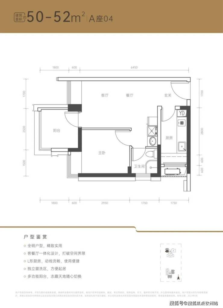 建面约50㎡上车小户,全明户型,客厅带飘窗,三分离卫浴,无过道零空间浪费。