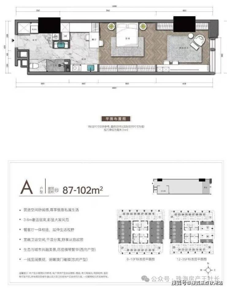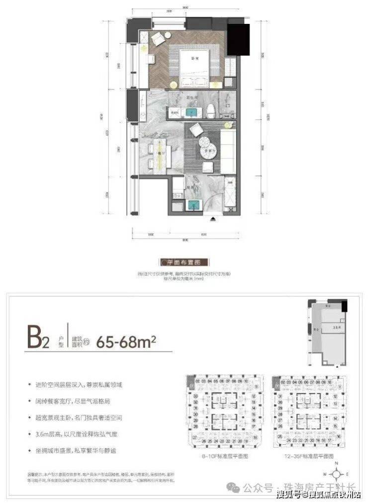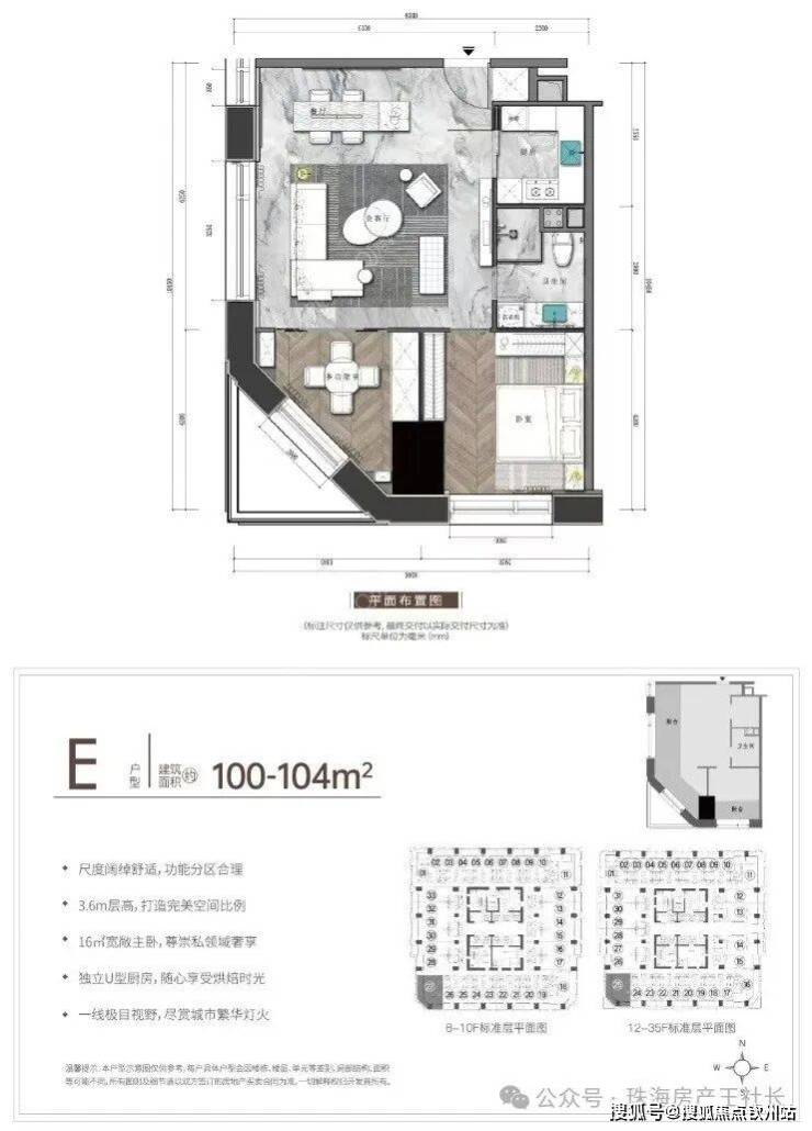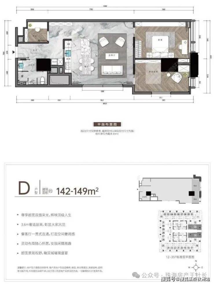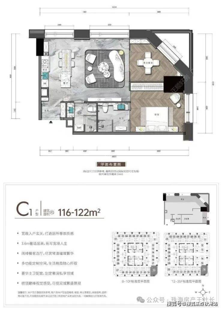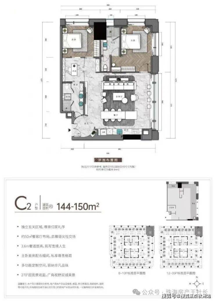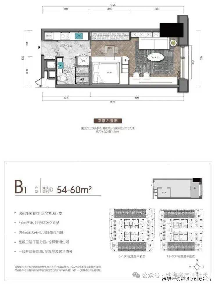 户型涵盖54-150㎡一至三房,部分高区大平层达273-833㎡,层高3.6米,精装交付(大平层除外)。