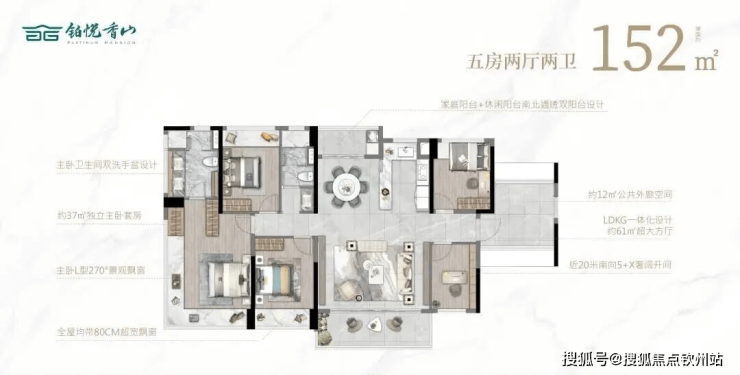 入户前留有玄关空间,LDKG一体化设计,主卧和次卧均配置了市面少有的L型270°转角飘窗,增加了生活空间的采光面和空间感。建面约152㎡5房户型,更是拉满了居住尺度。