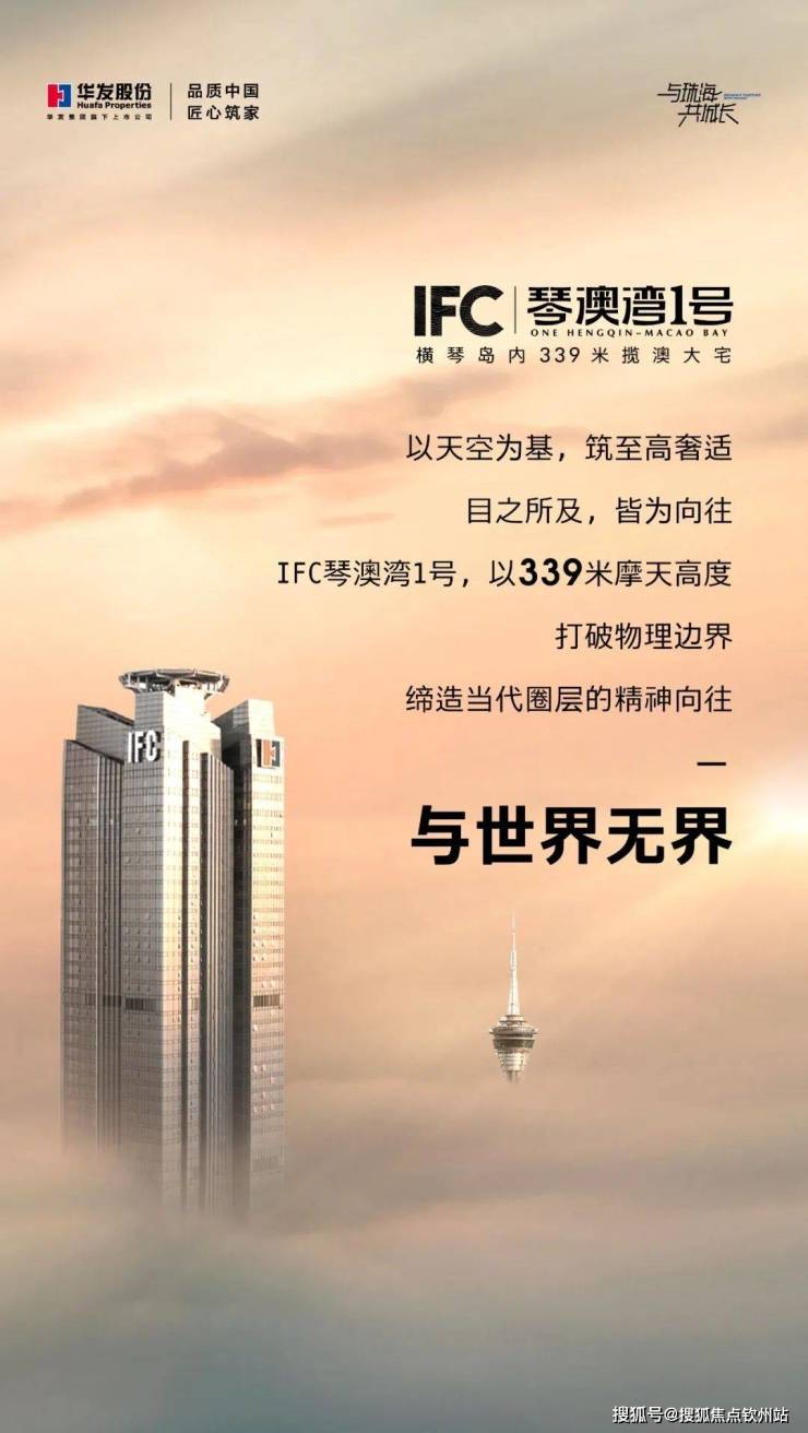 华发·IFC琴澳湾1号,就代表着这一张珍贵的入场券,以339米的凌云高度成为珠澳第一高楼,窗外两江汇流,山海拥和,一眼万亿。