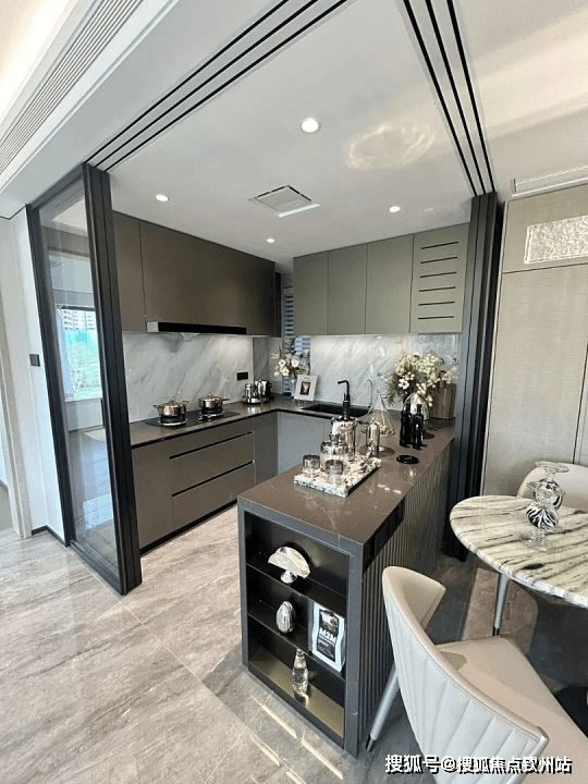 ·厨房交付实景:整体采用现代简约风格,橱柜颜色沉稳大气,搭配大理石台面,质感十足,还配备了品牌厨电。