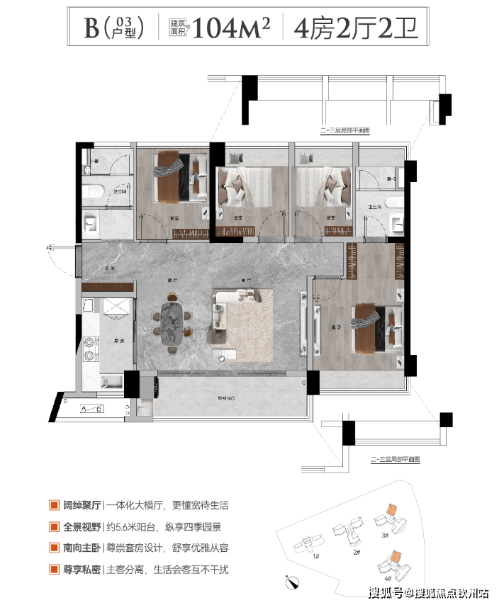 (2)104㎡四房两卫:折后总价185-203万,折后单价1.8万-1.95万元/㎡,公区零过道,适合二胎家庭。