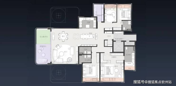 以项目约230㎡的户型产品为例,餐客厅为时下流行的大横厅设计,但以往的横厅户型,会与起居或功能空间放在一起,牺牲掉部分私密性。