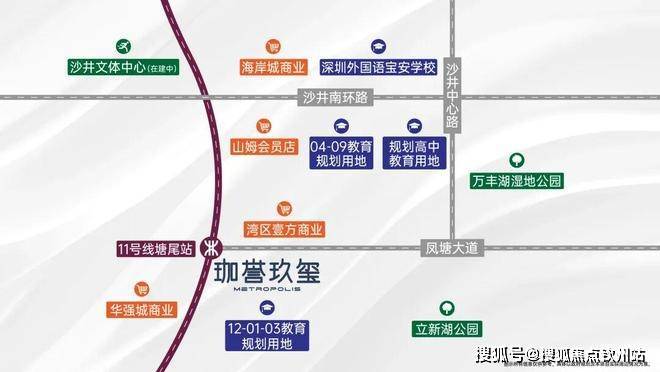 公共交通方面,「珈誉玖玺」位于综合体南侧,临近11号快线塘尾地铁站。