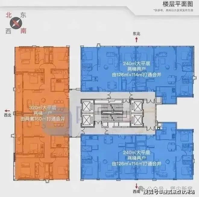 320㎡实际上是由两套160㎡原始户型合并而成,240㎡是由126㎡和114㎡打通合并而成。320㎡是两梯一户,240㎡是两梯二户
