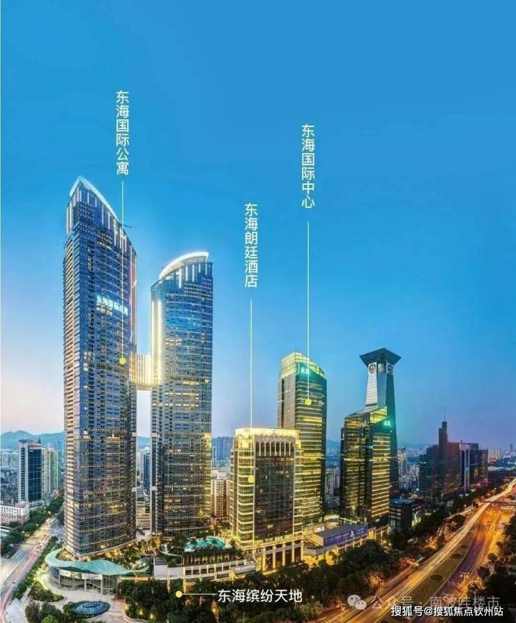 东海国际中心项目由办公楼、酒店、商务公寓、商业四大部分组成;是现今深圳深南大道两旁最大的综合建筑群,其中办公楼2幢,高度约为190米/150米;酒店1座,约为100米;商务公寓2幢,高度约为300米/255米;还有约65365平方米的商业。