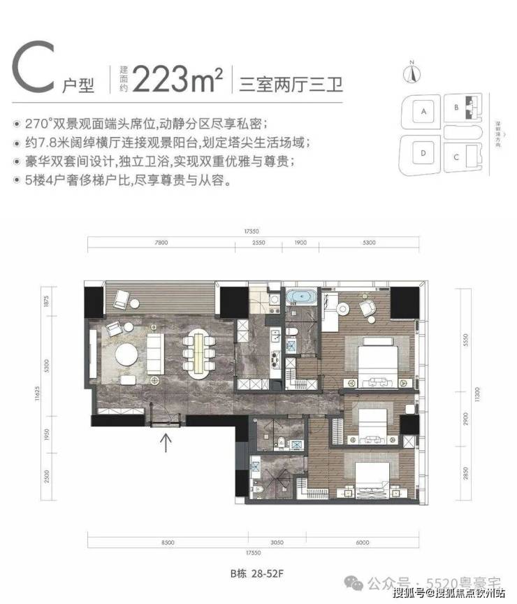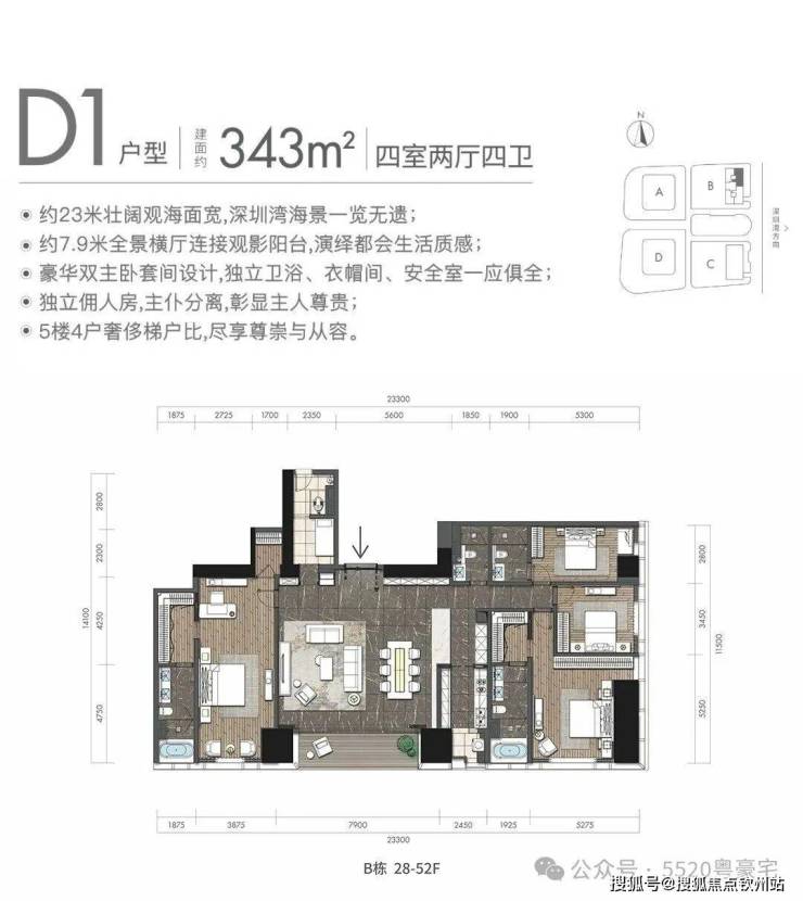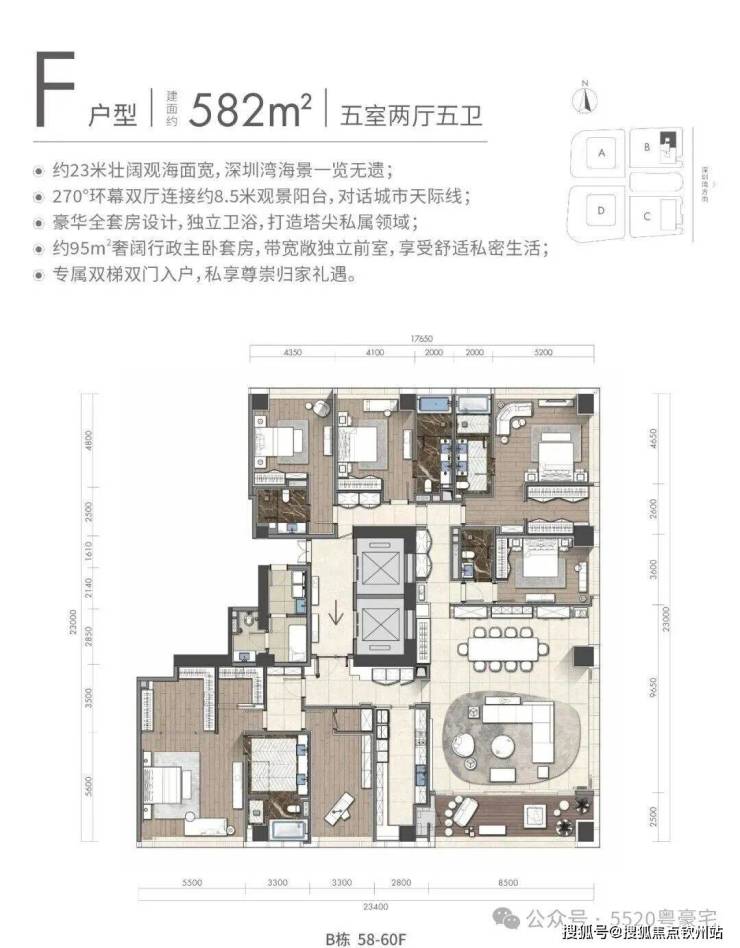项目推出160-582㎡一线海景公寓,户型涵盖二房至五房,满足不同家庭的居住需求。其中,B栋28-52层的223㎡三房三卫、340-343㎡四房四卫,41-51层的563㎡五房六卫,以及58-60层的582㎡五房五卫,都是极具代表性的奢居户型,大面积空间搭配环幕视野,将深圳湾的壮丽美景融入日常生活。