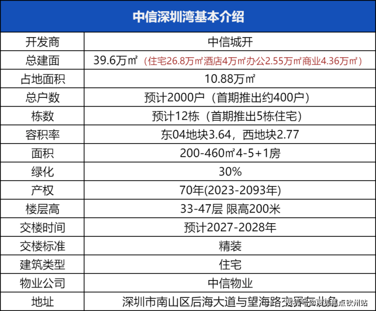 中信深圳湾规划总建筑面积约39.6万㎡、占地面积约约11万㎡、总户数约2000户,容积率为3.56,将建成涵盖约26.9万㎡的住宅、4.4万㎡的商业、4万㎡酒店以及2.6万㎡的办公等多种业态的大型综合体,并配建18班幼儿园,总货值超700亿。