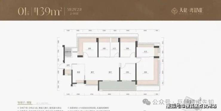 139㎡5房2卫:6.8米的阳台开间非常阔绰,大气,横厅设计,无死角,把5房实用效果发挥到极致,只需要4房的朋友,有需要衣帽间可以充分利用改出功能房,主卧也是带双面飘窗。