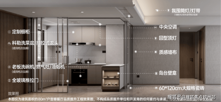入户赠送收纳功能强大的玄关柜,厨房天花采用石膏板+回型灯设计,客餐厅天花弧形吊顶、地面采用大地砖,造价更高、更耗时耗力,也更美观。