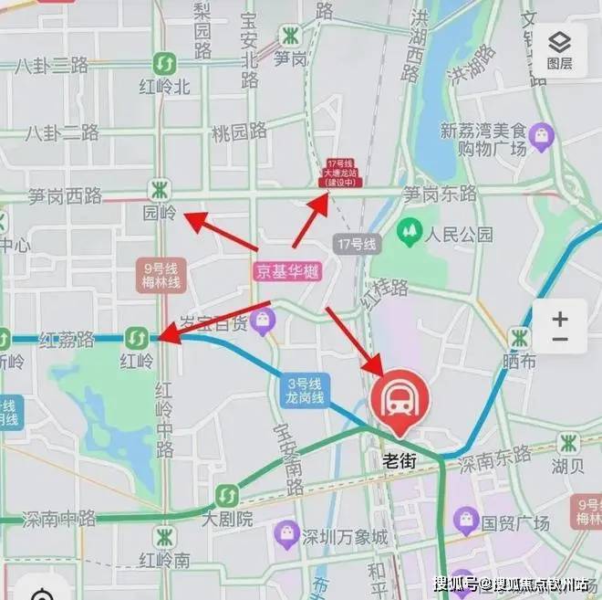 在交通配套方面,京基华樾周边有4条地铁线环绕。其中,3号和9号地铁线的“红岭站”距离约700米,步行大约需要11分钟;9号线的“园岭站”距离约1公里,步行大约需要16分钟;17号地铁线的“大塘龙站”距离约1.1公里,步行大约需要17分钟;1号和3号地铁线的“老街站”距离约1.2公里,步行大约需要20分钟。
