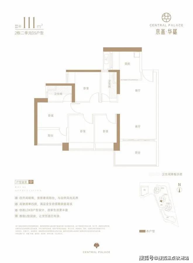 仅2栋2单元05户型才有,设计的是经典竖厅格局,LDKB一体化,动静分区,四开间朝南,U型厨房,卫生间干湿分离,得房率约73%(不含赠送),阳台西南朝向。