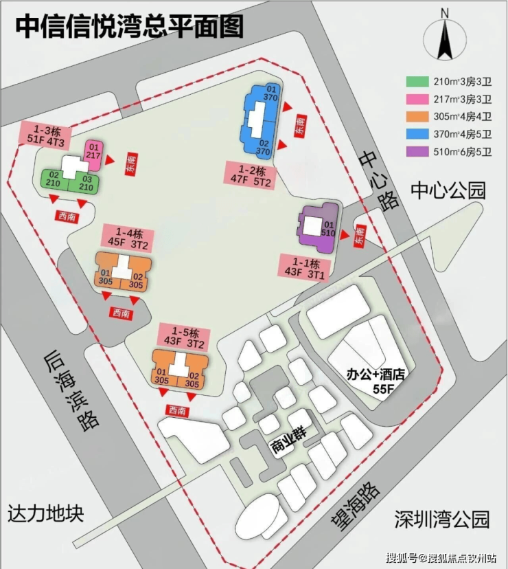 项目分两期,一期为住宅,二期为办公+酒店+商业,一期共有五栋43-51层超高层住宅,共约407套210-217-305-370-510㎡大平层。
